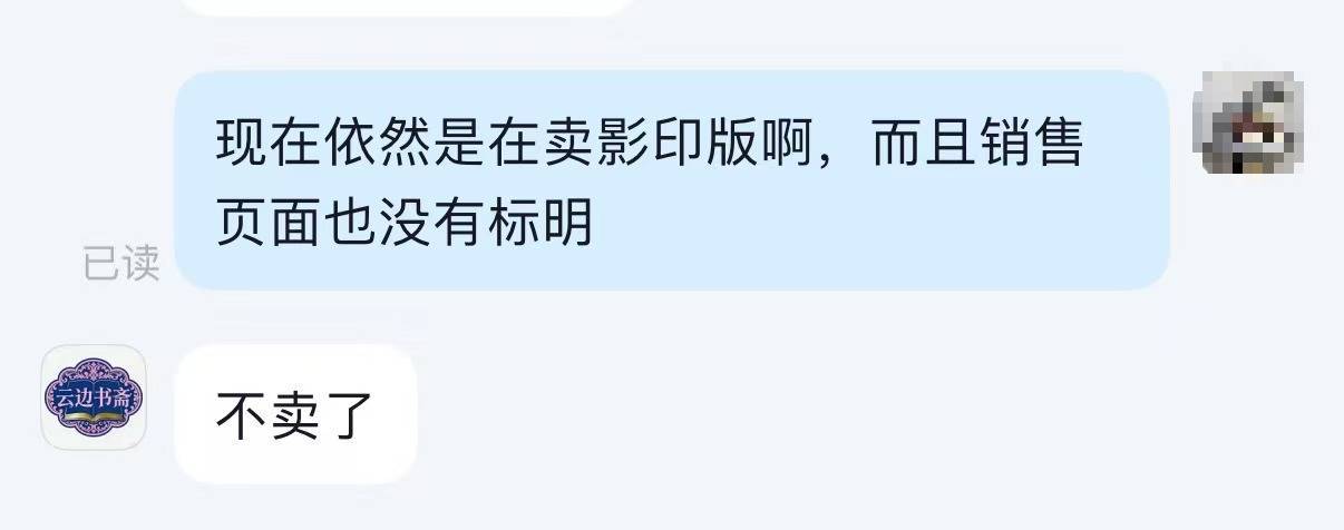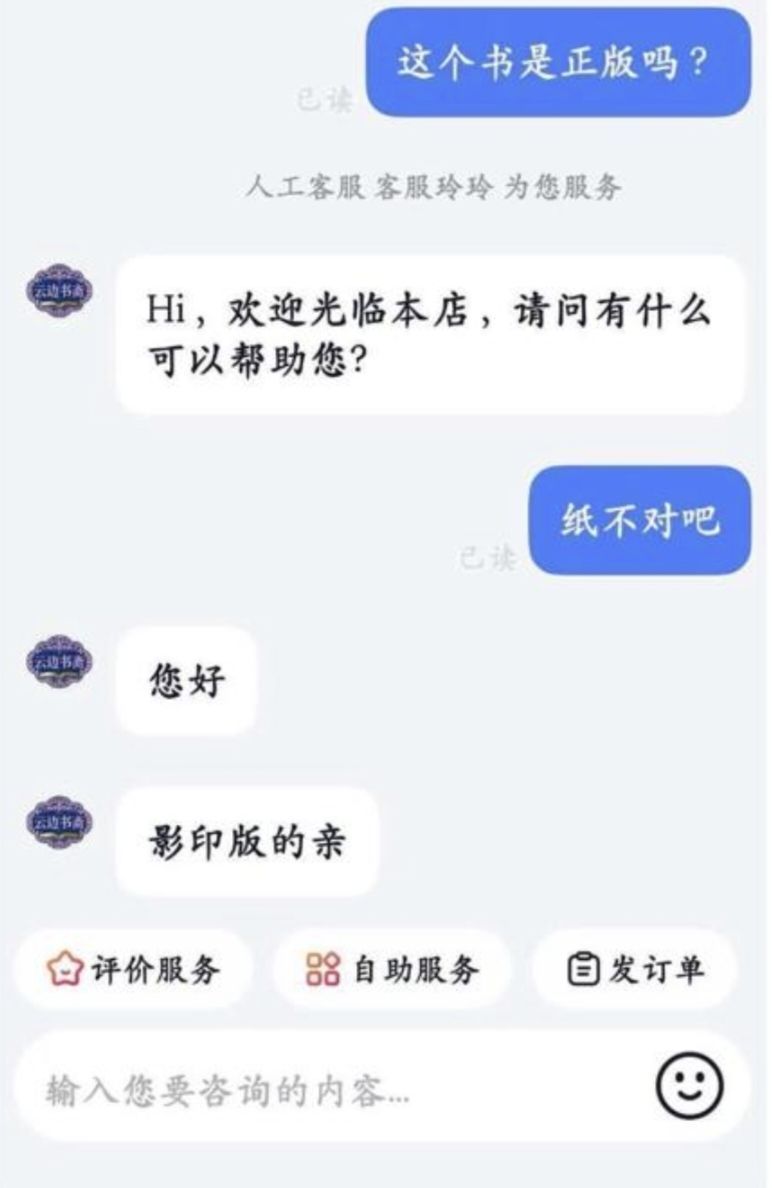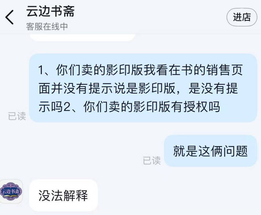近日,有网友发帖,称在又名叫“云边书房”的店铺购买竹素后,考虑商家是否是正版,商家回复“是影印版”。该网友质疑竹素是盗版。