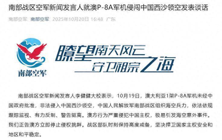 南部战区空军新闻发言东谈主李健健大校暗示,10月19日,澳大利亚1架P-8A军机未经中国政府批准,积恶侵入中国西沙领空,中国东谈主民开脱军南部战区组织海空军力,照章依规追踪监视、有劲反制、警告驱离。澳方手脚严重扰乱中国主权,极易激励海空不测事件。咱们正告澳方立即住手侵权寻衅。战区部队时候保抓高度防备,强硬捍卫国度主权安全和地区和牢固固。