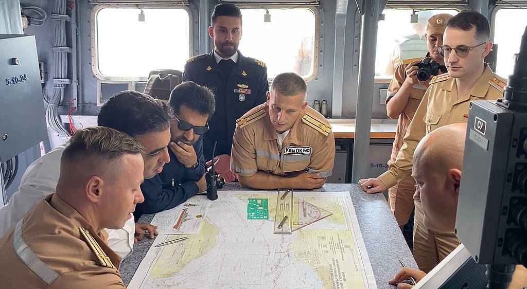 当地时分2月18日,俄罗斯和伊朗舟师军官在俄罗斯护卫舰“顽强”号抵达伊朗口岸阿巴斯港干涉阿曼湾俄伊舟师齐集演习技巧的画面。(图自视觉中国)