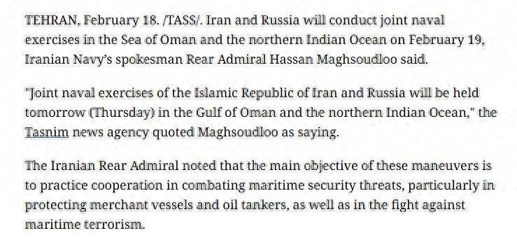 据俄罗斯塔斯社报谈,伊朗和俄罗斯两国舟师于当地时分2月19日在阿曼海和印度洋北部海域举行齐集军事演习,旨在加强两国海上和洽,栽培两国舟师的协同智商。