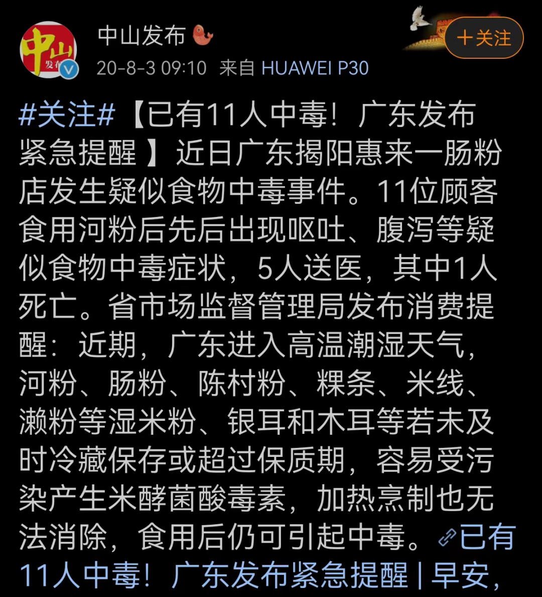 2020 年 7 月,广东惠来一家肠粉店内发生了扫数食物中毒案件。11 名顾主在食用河粉(粿条)之后,出现不同进度的吐逆、泻肚症状。其中 1 东谈主经全力抢救、医治无效后物化,2 东谈主的病情比拟危机,2 东谈主的病情较为雄厚,还有 6 东谈主因症状较轻,在家不雅察。