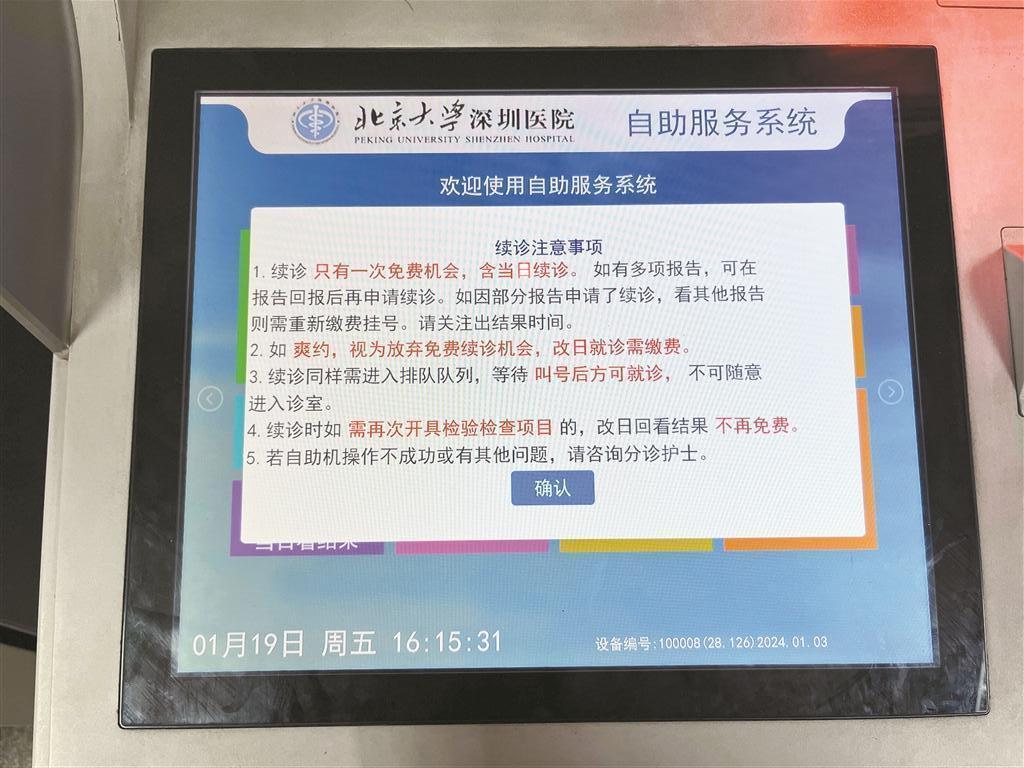 北京大学深圳病院自助挂号机推出了“改日看终结”功能,患者取了“续诊号”后,就会被列入就诊队伍,恭候叫号。就诊今日看汇报的,“拉链式”看诊,即“一个看汇报患者+一个其他患者”瓜代叫号。关于看汇报的患者,炫夸屏上会注明“看终结”字样。改天看汇报的,按挂号预约的时段,按律例和统统患者沿途列队,先约先得。这一作念法,让策略隆重落地。